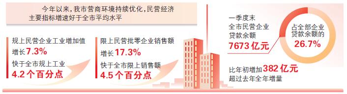 元气汇聚,蔚然成林。今年以来,我市营商环境持续优化,民营经济主要指标增速好于全市平均水平。规上民营企业工业增加值增长7.3%,快于全市规上工业4.2个百分点。限上民营批零企业销售额增长17.3%,快于全市限上销售额4.5个百分点。