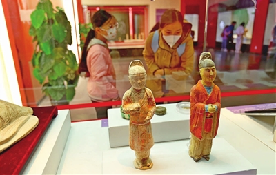 唐代乐舞是在我国古代乐舞艺术发展最繁盛的时期,广泛吸收周边各民族和外域乐舞的优秀成果,创造出绚丽多姿的大唐乐舞文化。舞马是唐代宫廷御用的娱乐马匹。唐玄宗天宝年间,每逢皇帝生日“千秋节”都会举行盛大宴会,并以舞马助兴。舞马在当时被视为盛世祥瑞之物,展览展出昭陵博物馆藏的白陶舞马,咸阳市礼泉县张士贵墓出土。董雪迎告诉记者:“此舞马通体细腻如象牙一般,形体矫健,姿态优美,是中国美术史上不可多得的佳作。舞马表演起源于西方,魏晋南北朝时传入中原,是当时马戏表演的一种,经过训练的舞马可以随音乐翩翩起舞;唐代是舞马发展顶峰时期。墓主张士贵,唐代开国名将,跟随李世民屡建战功,参与玄武门之变,死后陪葬昭陵。”