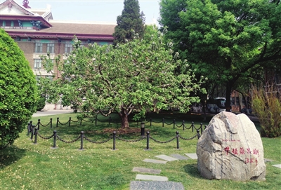 天津大学卫津路校区第九教学楼前的“牛顿苹果树”。照片由天津大学提供