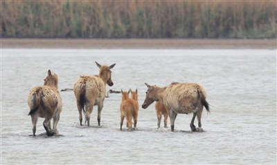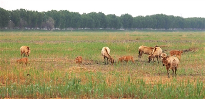 连日来,素有“京津绿肺”之称的我市七里海湿地不断传来好消息。工作人员在湿地腹地巡查时惊喜地发现,继今春新生四头小麋鹿后,上周鹿群中又多出了两个小生命,至此,七里海野化麋鹿今年产崽已达六头,为历年之最。目前,小鹿们在母鹿带领下悠然融入鹿群,已开始进入湖中试水。 通讯员 韩克武 本报记者 钱进 潘立峰 摄