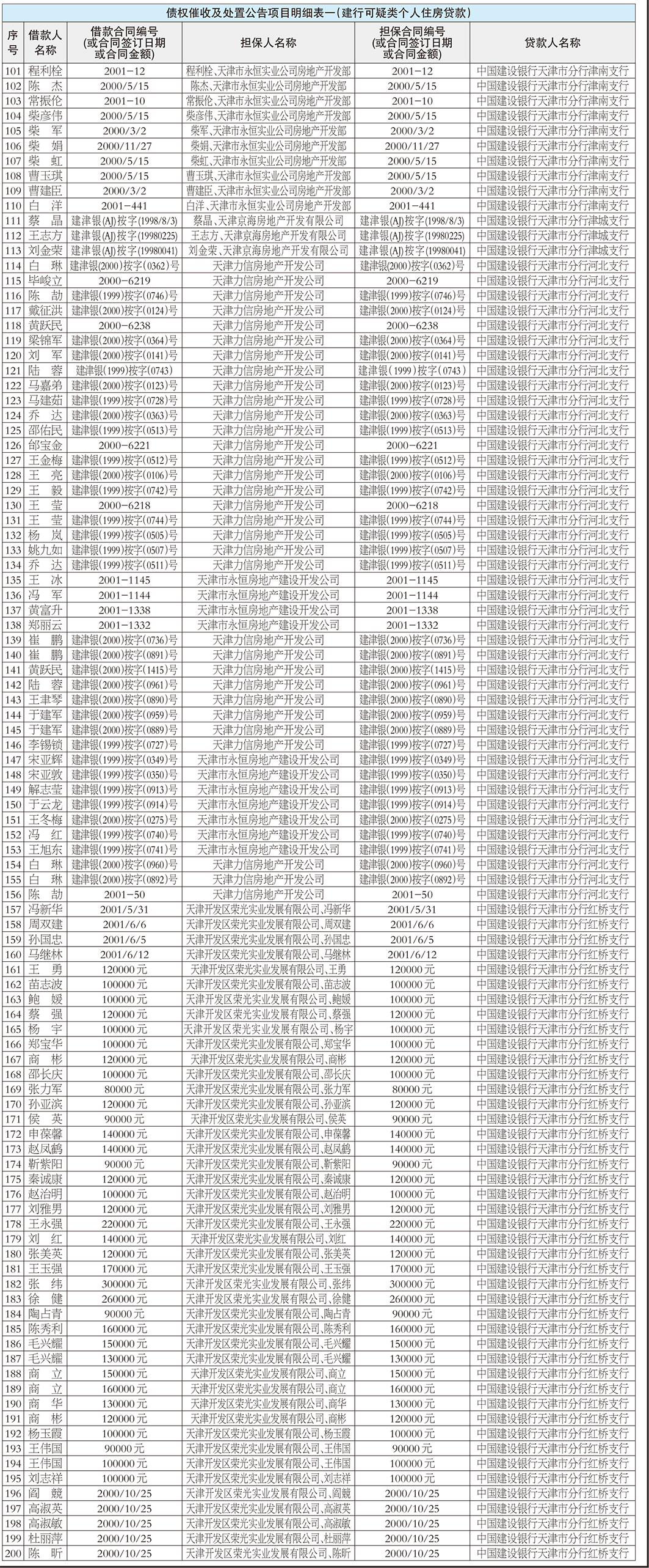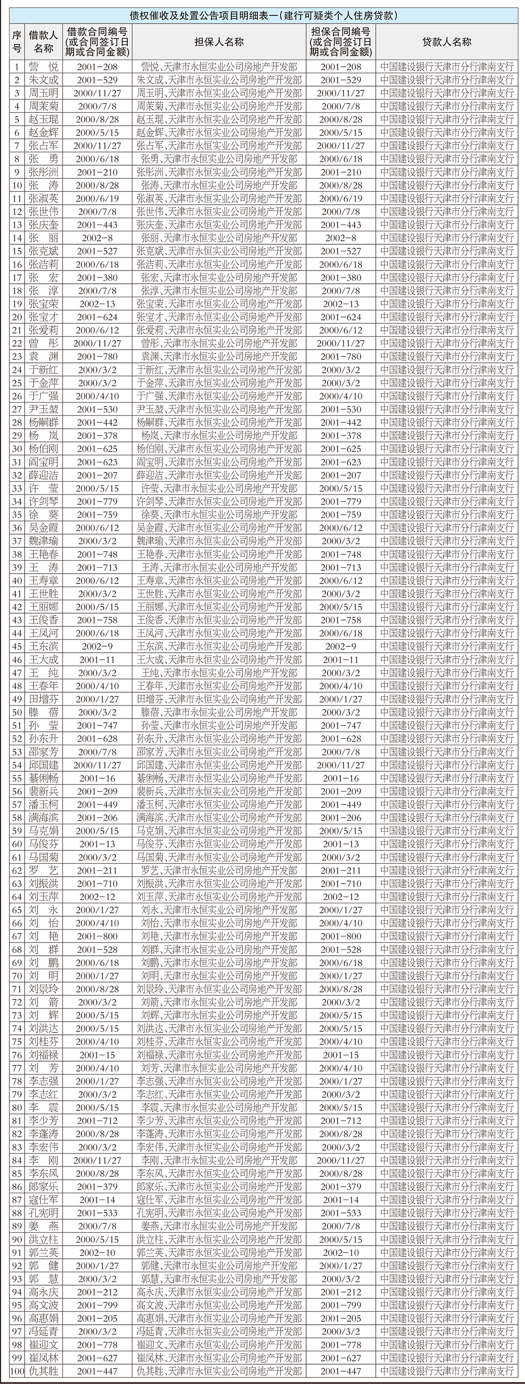 中国东方资产管理股份有限公司天津市分公司作为该等债权的债权人,现公告要求下列借款人及其相应的担保人或其承继人向中国东方资产管理股份有限公司天津市分公司履行相应合同约定的义务(若借款人、担保人因各种原因更名、改制、歇业、吊销营业执照或者丧失民事主体资格,请相关承债主体、清算主体代为履行义务或者承担清算责任)。