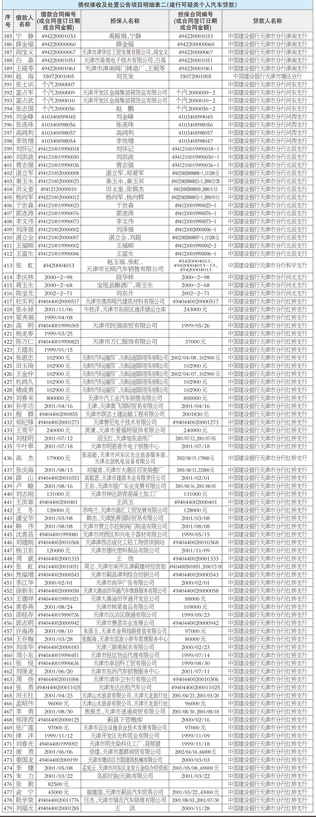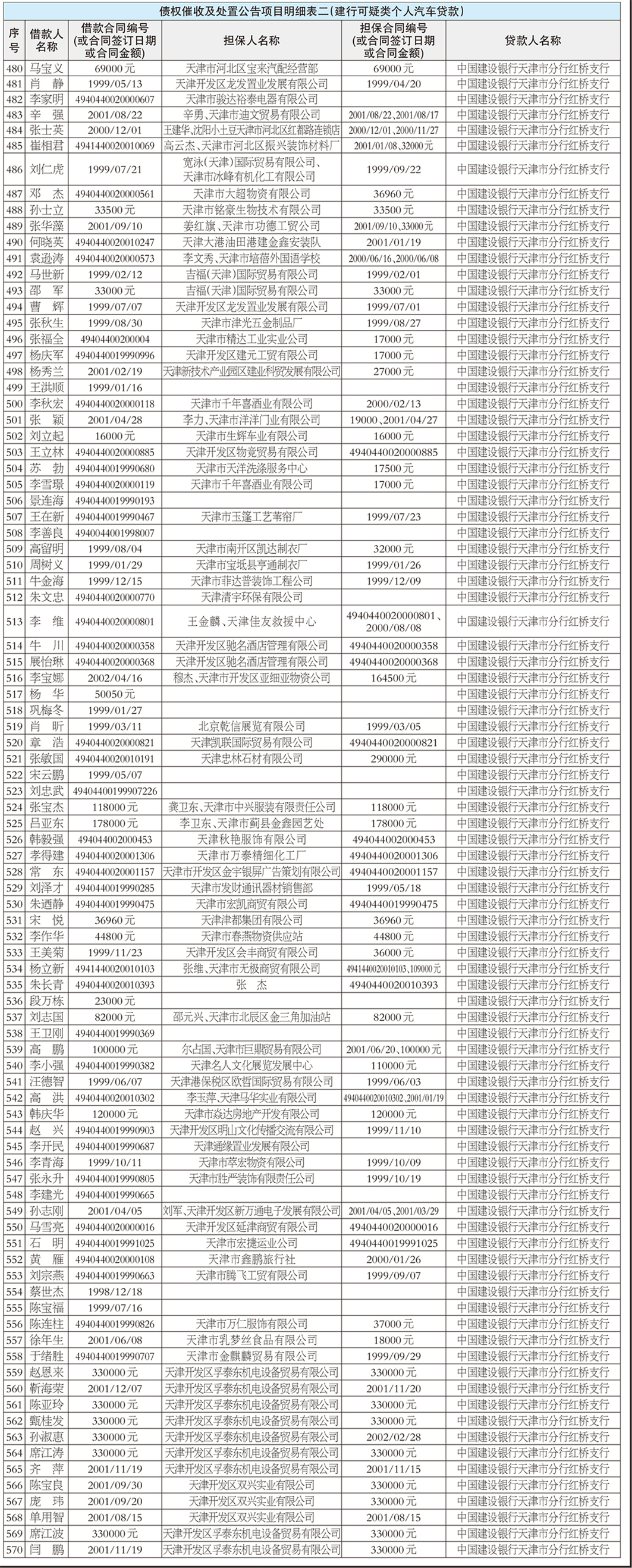 中国东方资产管理股份有限公司天津市分公司作为该等债权的债权人,现公告要求下列借款人及其相应的担保人或其承继人向中国东方资产管理股份有限公司天津市分公司履行相应合同约定的义务(若借款人、担保人因各种原因更名、改制、歇业、吊销营业执照或者丧失民事主体资格,请相关承债主体、清算主体代为履行义务或者承担清算责任)。