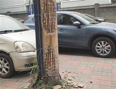 日前,有市民拨打本报热线23602777反映,在河西区琼州道52号楼前人行道上,一根水泥线杆出现水泥脱落、钢筋裸露情况,有倒伏隐患。