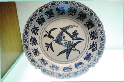 天博藏明代永乐青花枇杷绶带鸟纹盘,通体施白釉,满绘青花纹饰。口沿内绘一周青花缠枝莲纹,外口沿为一周汹涌澎湃的青花海水纹。内壁十六个花瓣内绘形状不同的青花折枝花果,外壁十六个花瓣内绘青花折枝菊纹,内底双弦纹内主题纹饰为青花绘枇杷绶带鸟图。整个画面布局疏朗明快,运笔顿挫有致,极富节奏感,纹样显然出自同时期宫廷画院画师的稿本。此盘胎质细腻洁白,釉层肥厚晶亮,外底无釉,抚之有糯米粉般的爽滑感,青花色泽浓艳,蓝中泛黑,是用进口的“苏麻离青”料所绘。