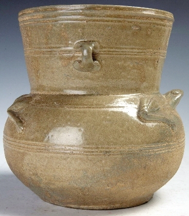 天博馆藏晋代青釉蛙形渣斗,敞口,直颈,扁圆形鼓腹,腹部塑蛙头、蛙足、蛙尾,口沿饰等距褐色斑点,是东晋时期典型特征。天博器物研究部副主任李君介绍,渣斗又称唾盂,是古代贵族宴饮唾鱼刺或兽骨的承器,瓷质唾盂始自东汉,三国、两晋颇为流行。