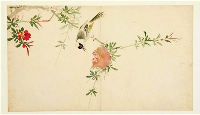 天博馆藏明代周之冕的《花卉册》,其所绘花卉,花朵用工笔勾勒,叶用写意手法,世称“勾花点叶法”,自成一家。此册共二十开,作写意花鸟,分别绘桂花翠鸟、折枝梅花、梨花飞燕、桃花双燕、芙蓉飞禽、芭蕉竹石等。其中,《石榴小鸟》画风清新明朗,图左侧树枝上绘几朵石榴花,色泽鲜艳浓烈,小鸟俯身踞居在树枝上,充满生动的情趣。