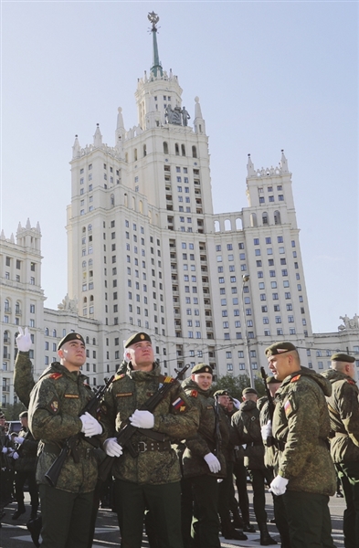 图:5月7日,在俄罗斯首都莫斯科拍摄即将参与彩排的士兵。 新华社发