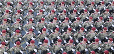 图:5月7日,在俄罗斯首都莫斯科,士兵列队行进。 新华社发
