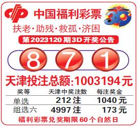 中国福利彩票第2023120期3D开奖公告