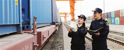 新港海关关员对即将发运的中欧班列进行现场监管。 照片由天津海关提供