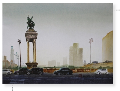 我的这幅水彩近作,主体是和平、河东两区之间的跨海河通道──大光明桥。桥头建有欧式的以日、月、星等为主题的“光明”雕塑桥头堡。