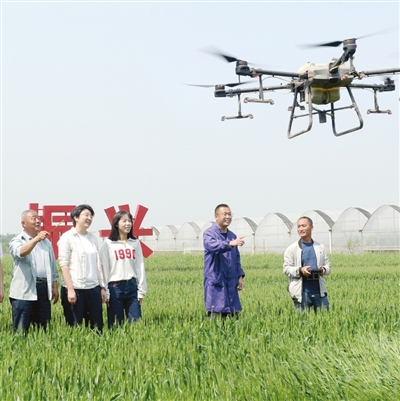 如今,丁家瞿阝村麦田引入了农用无人机进行作业。