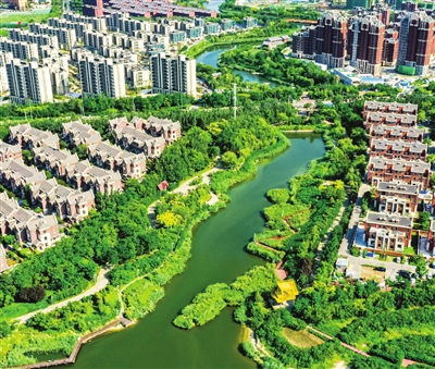 走进生态城,绿意盎然,一步一景。在这里,32公里生态廊道、公园、水系等景观遍布全城,植物种类多样化,随处可见绿而美的“地标”:比例达100%的绿色建筑、用能自给自足的零能耗建筑、完整的海绵城市体系、从“污水库”变身为天津市“最美河湖”的静湖……“碧岛绿谷、绿网交织、珠落玉盘”的蓝绿空间令人赏心悦目。