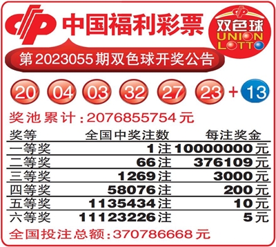 中国福利彩票第2023055期双色球开奖公告