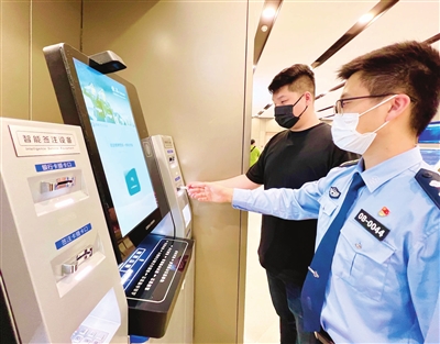 昨日,市民在出入境管理总队接待大厅使用智能签注设备自助办理港澳团队旅游签注。 本报记者 孙立伟 通讯员 刘贝贝 摄