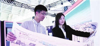 昨天,第七届世界智能大会开幕,参展人员阅读《天津日报》当日特刊。