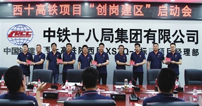 日前,中铁十八局西十高铁项目部举行“创岗建区”启动会,为“红旗责任区”“党员先锋岗”授旗(牌)。全长22.9公里的秦岭马白山隧道成为全线隧道光面爆破样板,正洞和斜井5月17日累计掘进突破9818米。(邓延虎)