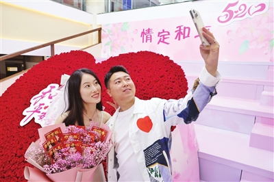 昨日,我市各婚姻登记部门“为爱加班”。在和平区婚姻登记处举行集体办证仪式后,准新人们在“携手百年”长廊打卡留念。