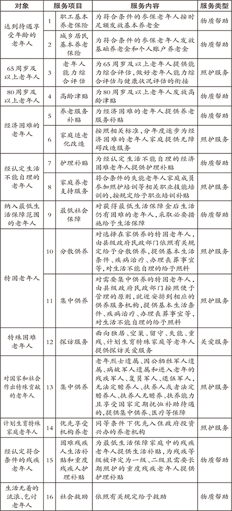 (二)主要任务。基本养老服务是指由国家直接提供或者通过一定方式支持相关主体向老年人提供的,旨在实现老有所养、老有所依必需的基础性、普惠性、兜底性服务,包括物质帮助、照护服务、关爱服务等内容。基本养老服务的对象、内容、标准等根据经济社会发展动态调整,“十四五”时期重点聚焦老年人面临家庭和个人难以应对的失能、残疾、无人照顾等困难时的基本养老服务需求。