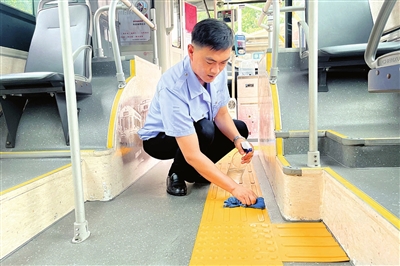 本报讯(记者 苏晓梅 摄影 张磊 通讯员 蔡婕妤)在第三十三个全国助残日到来之际,公交巴士公司华苑车队903路驾驶员陈林为公交车铺设了一条约5米长的“爱心盲道”,引得乘客纷纷称赞。