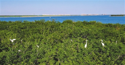 图为位于西青区的鸭淀水库碧波荡漾,众多鸟类栖息于此。