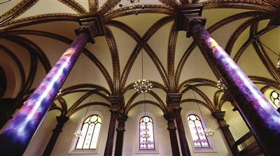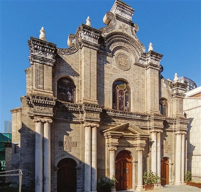 圣鲁易堂1872年建于法租界圣鲁易路(今营口道),是这条路上现存最早的建筑。至于究竟是教堂因道路得名,还是道路因教堂得名,实难考证。圣鲁易堂占地6.8亩,建筑面积779平方米。它是一座具有浓郁文艺复兴晚期风格的希腊式教堂,外观庄重而和谐。教堂砖木结构,钟楼呈半圆形,上面有精美的葡萄、玫瑰花造型雕刻。大门左右的罗马柱柱头有百合花雕饰,充满艺术气息。教堂内部十分考究,满铺红、蓝、白三色瓷砖,瓷砖上有十字架装饰。祭台两侧供奉着两尊圣像,一为法王路易九世,一为圣女贞德。墙壁上镶嵌一块白色大理石,用法文镌刻着为教堂建筑捐资者的名字。教堂两侧的半圆形拱窗由菱形彩色玻璃拼成,营造出一种神秘而奇异的氛围。这里的唱经楼更加典雅,沿螺旋式楼梯向上,便能看到一架赫然而立的古典管风琴。据说这是当时天津各教堂内仅有的两架古典管风琴之一。管风琴的紫铜音管靠墙而排,直向穹顶,演奏时音响宏大丰满,音色圆润和谐,音域宽广辽阔。