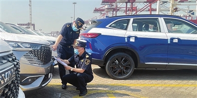 海关关员对出口汽车进行现场监管。 天津海关供图