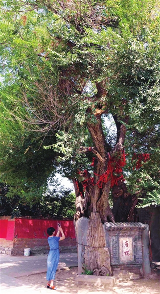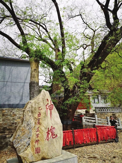 离开蓟州区东后子峪村,途径于桥水库一路向北,行车20多公里,就到了穿芳峪镇东水厂村。这里有一株高大的“神槐”远近闻名,每年吸引如织的游人前来观赏打卡。这株古槐树已有1630年树龄,是我市现存最年长的古树。如今,古槐苍劲挺拔,枝繁叶茂,树下立有著名书法家王学仲先生写下的“神槐”二字石碑。