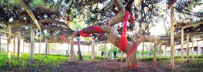 据了解,这株“蟠龙松”种植于明朝洪武初年,至今树龄已有655年。蓟州区官庄镇乡村振兴服务中心主任秦涛告诉记者,最近十几年里,“蟠龙松”的树冠又向外生长了近2米,如今树冠覆荫面积将近一亩。目前,这株“蟠龙松”属国家一级保护古树,列入了中华古树名木名录。