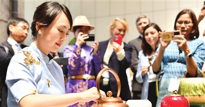 5月22日,在意大利罗马的联合国粮农组织总部,福建安溪铁观音茶文化系统的代表表演茶艺。 新华社发