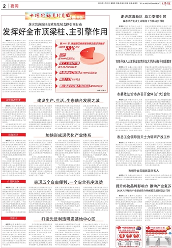 本报讯(记者 王睿)市委、市政府部署“十项行动”,明确实施滨海新区高质量发展支撑引领行动,赋予了滨海新区新定位、新使命。目前,滨海新区服务京津冀协同发展成效显著、现代化产业体系加快形成、新动能加速集聚、改革开放活力绽放,高质量发展态势持续巩固。