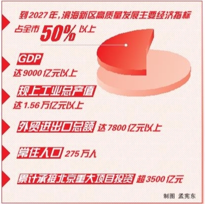 预计到2027年,滨海新区高质量发展主要经济指标占全市50%以上,GDP达9000亿元以上,规上工业总产值达1.56万亿元以上,外贸进出口总额达7800亿元以上,全社会研发投入强度达3.8%,常住人口275万人,累计承接北京重大项目投资超3500亿元,基本建成生态、智慧、港产城融合的宜居宜业宜游宜乐美丽“滨城”。