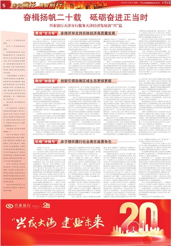 20载风雨兼程,兴业银行天津分行坚持总行发展战略,始终紧扣时代发展脉搏,坚持把党的建设融入分行经营管理的各个环节,扎实服务实体经济,高效履行社会责任,倾心尽力支持天津经济社会高质量发展,一步一个脚印地闯出一片新天地。