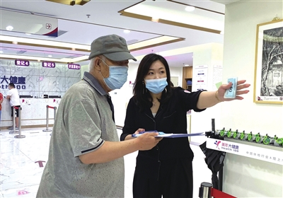 在鼓楼分院入口处,美年大健康天津公司副总经理兼行政总经理杜雪莹承担了迎宾工作。“您好,欢迎来到美年大健康体检!请您戴好口罩,到前台登记。”伴随着一声声亲切的问候,杜雪莹总经理为每位前来体检的客户提供了分诊指引。步入分院,美年大健康天津公司副总经理兼营销中心总经理张锦滢早已在检区等候多时。“经颅多普勒诊室在这边,您跟我往这边走。”张锦滢总经理一边主动为客户指引科室路线,一边悉心提示他们检中的注意事项。