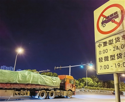5月21日20点20分,记者来到市民反映的外环南路(友谊南路至大沽南路路段),发现确如齐先生所说,大货车违章现象频发。有的大货车随意变道,有的疯狂抢灯,有的连续鸣笛……夹杂在各种大货车之间的小型客车艰难前行。记者注意到,路边每隔百米左右就立有一块交通指示牌,明确写有“中重型货车0:00—24:00禁行”。