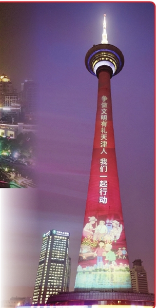 本报讯(记者 孟若冰)“争做文明有礼天津人 我们一起行动”“美丽天津是我家 文明有礼靠大家”……昨晚的津城,格外璀璨,“争做文明有礼天津人”主题灯光展示在天塔和海河两岸同时上演。