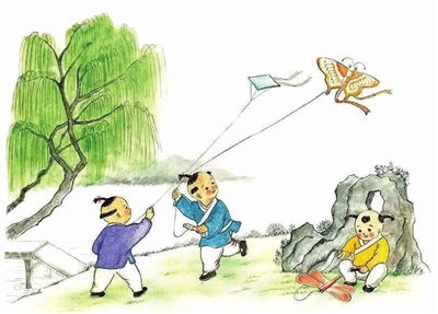 清朝诗人孔尚任也有一首《风筝》诗:“结伴儿童裤褶红,手提线索骂天公。人人夸你春来早,欠我风筝五丈风。”几个儿童兴致勃勃,结伴去野外放风筝,却等不到足够的春风,吵吵嚷嚷地骂老天不公平,我放风筝你却不给力。一个“骂”字,体现了儿童对放风筝的钟爱,表现了儿童的稚气可爱。