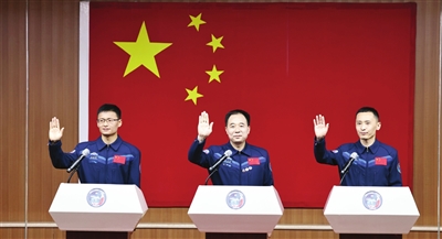 5月29日,神舟十六号航天员乘组与中外媒体记者集体见面会在酒泉卫星发射中心问天阁举行。这是指令长景海鹏(中)、航天飞行工程师朱杨柱(右)、载荷专家桂海潮挥手致意。 新华社记者 李刚 摄