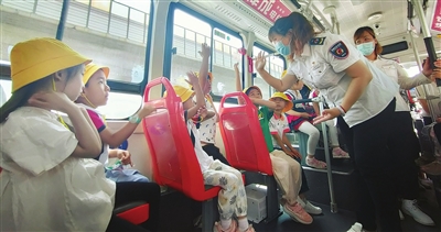 “小朋友们,在站台上等车时不要嬉戏打闹。”“要按次序上车,坐稳扶好,手和头不能伸出车窗。”公交8路志愿者李爽耐心讲解和演示着。