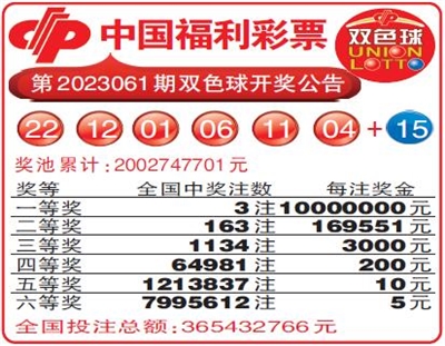 中国福利彩票第2023061期双色球开奖公告