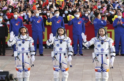 6时44分,中国载人航天工程总指挥、空间站应用与发展阶段飞行任务总指挥部总指挥长许学强下达“出发”命令,景海鹏、朱杨柱、桂海潮3名航天员领命出征。