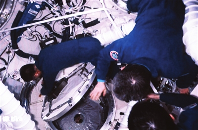 神舟十五号航天员乘组打开天和核心舱气闸舱径向舱门并向神舟十六号航天员乘组挥手致意。新华社发