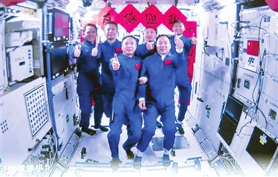 神舟十五号航天员乘组与神舟十六号航天员乘组拍下“全家福”的画面。 新华社发