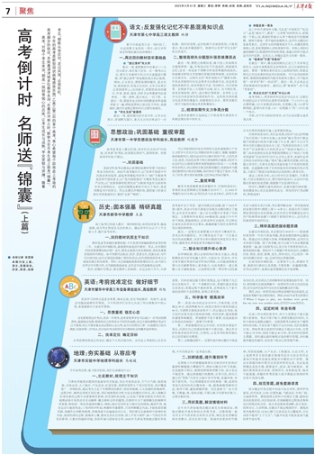 高考,对每个考生来说,都是一段刻骨铭心的历练,让考生成长与成熟,学会坚韧与拼搏。随着高考脚步的临近,本报邀请津城多位教学名师,在最后冲刺之时,联袂为全市考生送上助考“锦囊”。