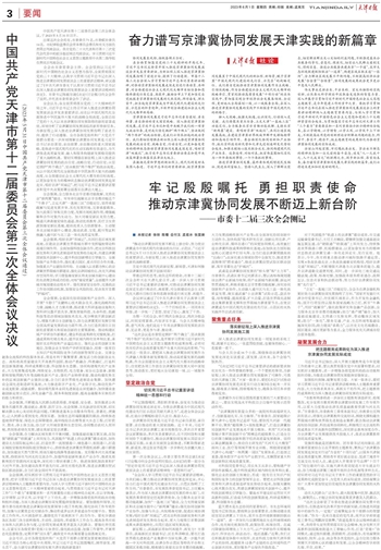 带着这样的思考,肩负这样的使命,市委十二届三次全会昨天在天津礼堂召开,进一步深入学习贯彻习近平总书记重要讲话精神,对推动京津冀协同发展走深走实进行再动员、再部署,对全面建设社会主义现代化大都市目标任务和思路举措进行再完善、再提升。