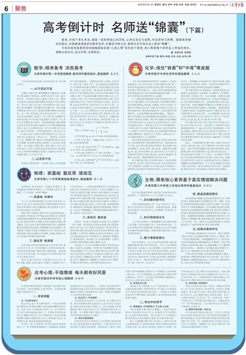 高考,对每个考生来说,都是一段刻骨铭心的历练,让考生成长与成熟,学会坚韧与拼搏。随着高考脚步的临近,本报邀请津城多位教学名师,在最后冲刺之时,联袂为全市考生送上助考“锦囊”。