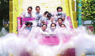 在水上公园欢乐岛内,游人如织,孩子们体验大型游乐项目,感受节日的欢乐。