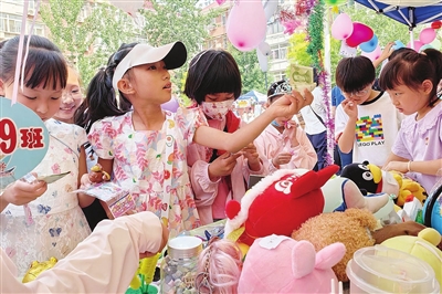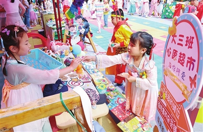 河东一幼举行欢乐市集。孩子们身着各自喜爱的服饰,用老师奖励的小红花换取中意的物品。