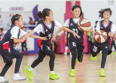 动起来,跑起来,南开区华夏小学女子篮球队的孩子们在球场上欢度“六一”。