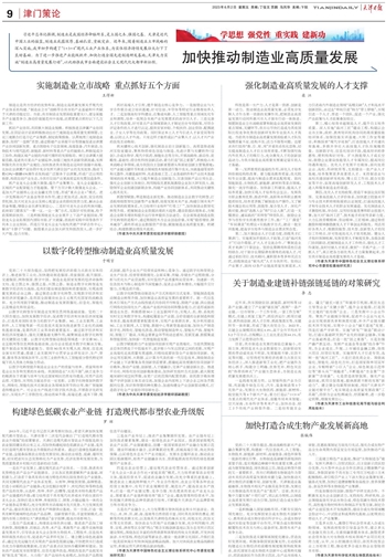 党的二十大报告提出,推动战略性新兴产业融合集群发展,构建新一代信息技术、人工智能、生物技术、新能源、新材料、高端装备、绿色环保等一批新的增长引擎。生物制造是破解资源瓶颈的重要手段,是实现碳达峰碳中和的重要支撑,必将成为继智能制造、绿色制造之后,制造业转型升级的又一重要抓手。我市已明确将生物制造作为带动未来经济高质量发展的关键力量,加快推动天津生物经济前瞻布局、创新发展。天津制造业基础雄厚,生物技术相关产业极具竞争优势,发展壮大生物制造具有优良产业“基因”。目前,我市正集中力量实施“十项行动”,须以此为契机,以制造业高质量发展行动为引领,加快打造合成生物产业发展新高地。